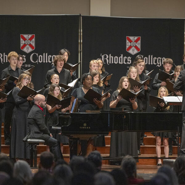 While majors hone their understanding of music theory and history in the classroom, many are drawn to the department’s diverse vocal and instrumental ensembles available to all students. The Rhodes College Orchestra and Rhodes 100 Pep Band led by Jonathan Schallert, David Shotsberger’s Rhodes Jazz Ensemble, and Sunshine’s Archipelago Ensemble frequently perform on campus and around Memphis, while Chamber Ensembles offer more intimate experiences for students to further their performance skills. Many of these ensembles are deeply intertwined with Rhodes’ legacy in Memphis, but perhaps none more so than the Rhodes Singers vocal ensemble. Originating in 1934 under Louis Nicholas ’34, the program was cemented by Burnet C. Tuthill in 1937 and has been woven into the fabric of the college’s history. For almost a century, the college’s flagship vocal ensemble has performed a wide variety of choral repertoire in Memphis and around the country. Their prowess has even seen them tour internationally, with stops in Dublin, Rome, Poland, the Czech Republic, and many other destinations.