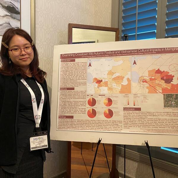 Chi Nguyen, a sophomore urban studies major from Hanoi, Vietnam, received second place in the Map Gallery Competition at the 24th annual Memphis Area Geographic Information Council (MAGIC) Conference held Nov. 20-21. She presented her project titled “Examining Crosstown Mid-Autumn Festival and Vietnamese Cultural Impacts in Memphis.”