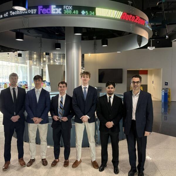 Rhodes College students Cole McNair ’26 (business), John Mori ’26 (business), Jason Rubinstein ’27 (business), Graham Allen ’26 (business), and Ismail Malik ’26 (economics and business) secured first place at the Mid-South competition of the Chartered Financial Analysts (CFA) Institute Research Challenge held Feb. 21 at The University of Memphis.