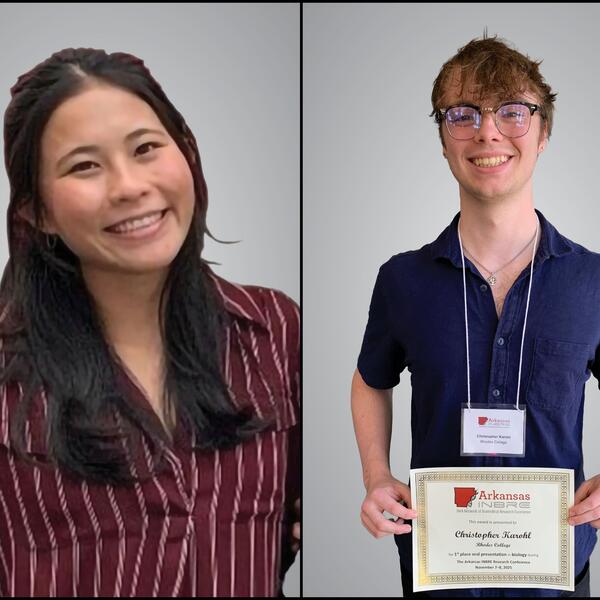 Rhodes students Christopher Karohl ’27and Jennifer Bui ’26 received honors at the Arkansas IDeA Network of Biomedical Research Excellence conference held Nov. 7-8, in Fayetteville, AR. The conference included participants from colleges and universities in Arkansas and surrounding states who presented research in the biological sciences, physics, and chemistry and biochemistry.
